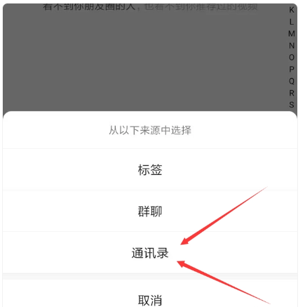 6.在下方彈出的窗口中有標(biāo)簽、群聊、通訊錄三個選項,我們以通訊錄為例,點擊【通訊錄】。如下圖: