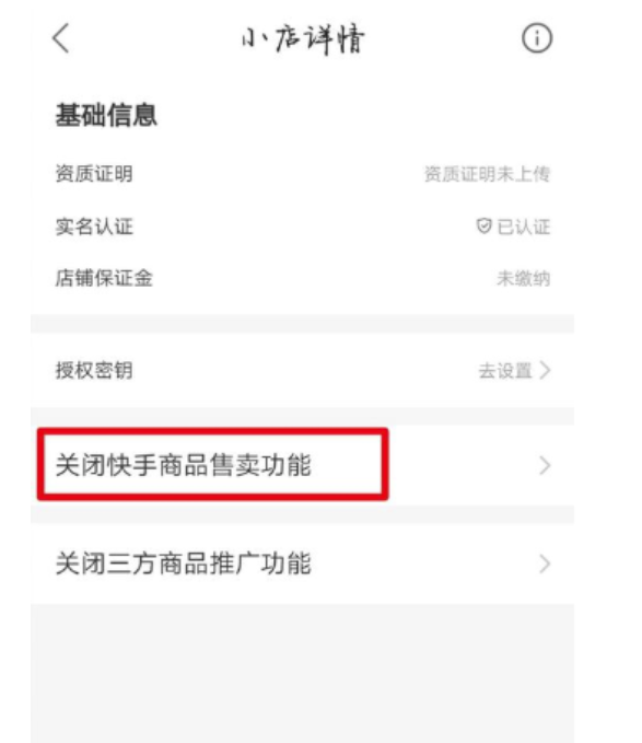 5、進(jìn)入小店詳情頁,點(diǎn)擊關(guān)閉快手商品售賣功能;