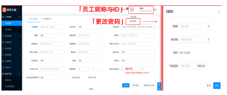 「更改密碼」鼠標(biāo)需要懸停在「員工昵稱與ID」位置,會(huì)出現(xiàn)「切換店鋪」和「更改密碼」選項(xiàng),點(diǎn)擊「更改密碼」進(jìn)行密碼設(shè)置。