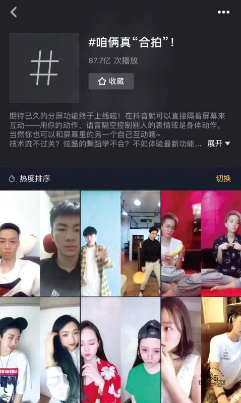 針對(duì)這個(gè)全新的視頻互動(dòng)玩法,抖音還于當(dāng)時(shí)上線(xiàn)了名為#咱倆真“合拍” !的挑戰(zhàn)賽,上線(xiàn)當(dāng)日即有超過(guò)6萬(wàn)人參與,截至2018年10月,該挑戰(zhàn)賽播放次數(shù)已超87億。