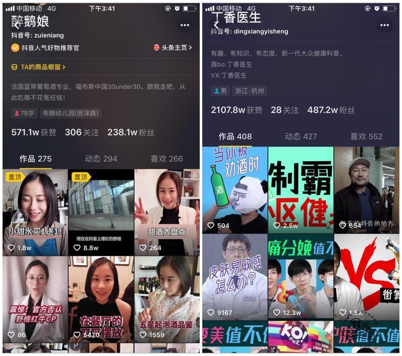 在抖音同學(xué)推薦學(xué)習(xí)的賬號(hào)里,“醉鵝娘”和“丁香媽媽”這兩個(gè)賬號(hào)我們覺(jué)得很不錯(cuò)。他們的平均粉絲數(shù)比較高,且總粉絲數(shù)也比較好。
