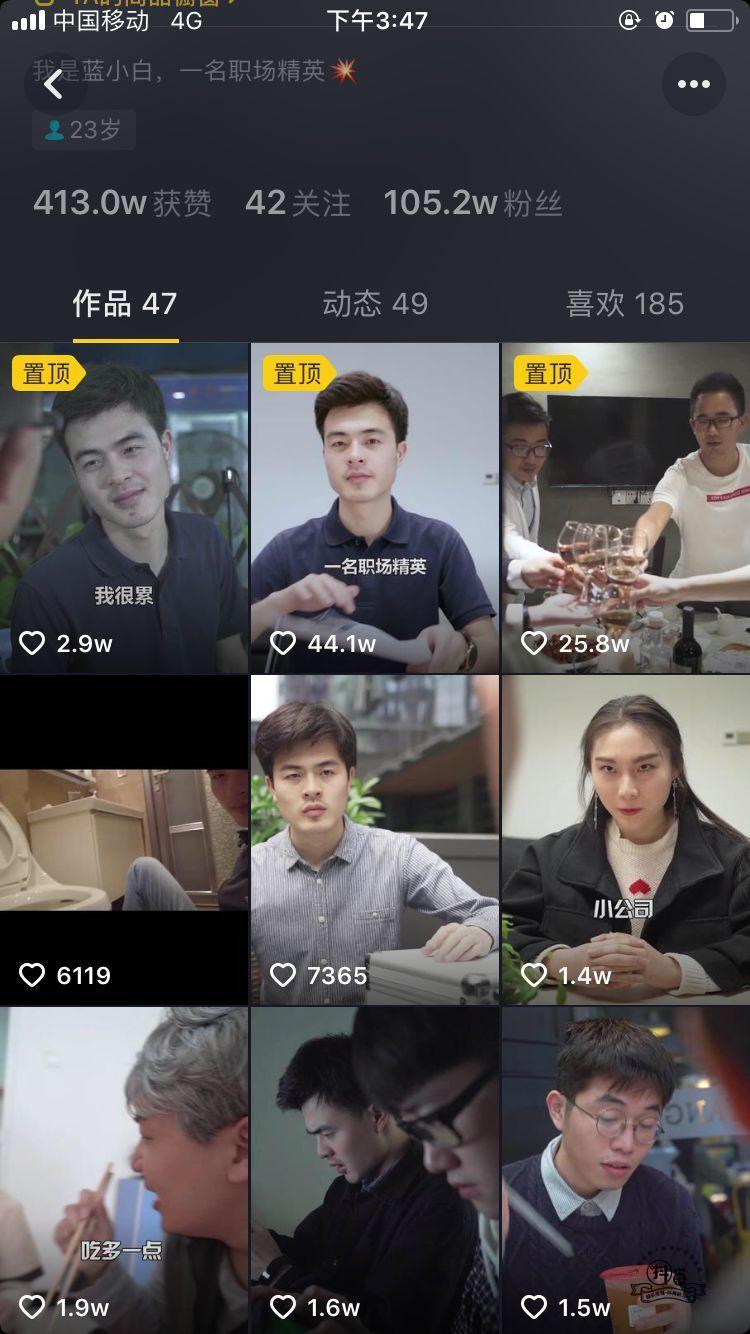 而“藍(lán)小白”的視頻,講“加班/加薪”等員工和老板沖突的視頻,更容易爆。