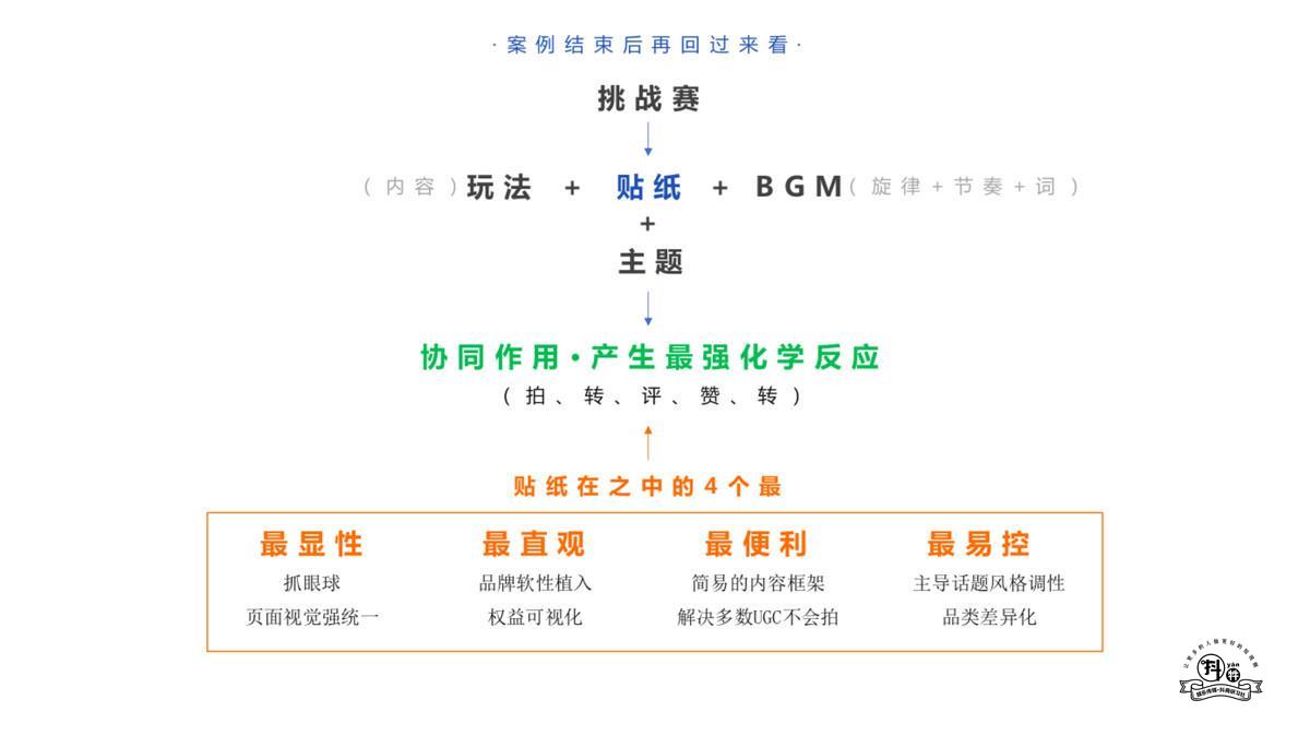 陳澎以商業(yè)化挑戰(zhàn)賽為例,解析了貼紙在其中的應用。商業(yè)化挑戰(zhàn)賽是通過融入品牌元素和獎勵機制的 某種玩法示范 ,強引導用戶積極參與互動 , 實現(xiàn)品牌訴求的一種營銷方式 。與商業(yè)化挑戰(zhàn)賽的結合,則讓貼紙更為高效的促進品牌價值提升?!爸?題 + 玩 法 + B G M + 貼 紙是商業(yè)化挑戰(zhàn)賽的4大要素,其中貼紙可以起到平衡作用,在客戶需求與用戶喜好之間實現(xiàn)平衡,在硬性植入與藝術演繹之間實現(xiàn)平衡?!标惻旆窒淼?。