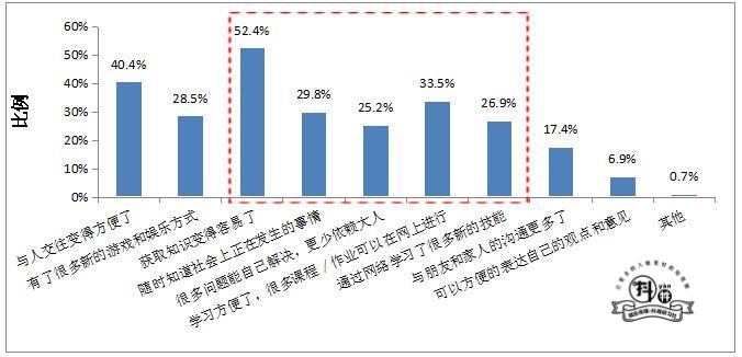 根據(jù)《中國未成年人互聯(lián)網(wǎng)運用和閱讀實踐報告(2017~2018)》顯示:青少年普遍認為互聯(lián)網(wǎng)對自己的學習起了積極作用,例如互聯(lián)網(wǎng)使他們“獲取知識變得容易了”(52.4%)、“學習方便了,很多課程/作業(yè)可以在網(wǎng)上進行”(33.5%)、“通過網(wǎng)絡學習了很多新的技能”(26.9%)、“很多問題能自己解決,更少依賴大人“(25.2%)等。