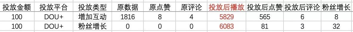 每個(gè)視頻DOU+預(yù)算300,1個(gè)小時(shí)投100,總共投三輪。當(dāng)數(shù)據(jù)下滑,就投100,小成本投入屢試不爽。
