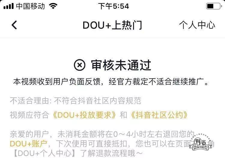 其實(shí)上面的情況僅僅是其中一種情況,還有一些正在投放途中,或者即將投放結(jié)束,被系統(tǒng)提示 “視頻因違規(guī)等原因” 停止投放;值得一提的是:一般視頻使用DOU+提交之后,需要進(jìn)行審核,審核通過(guò)之后,推薦不超過(guò)48h,如果審核失敗,錢會(huì)原路退回。在碰到這種情況時(shí),請(qǐng)大家注意: