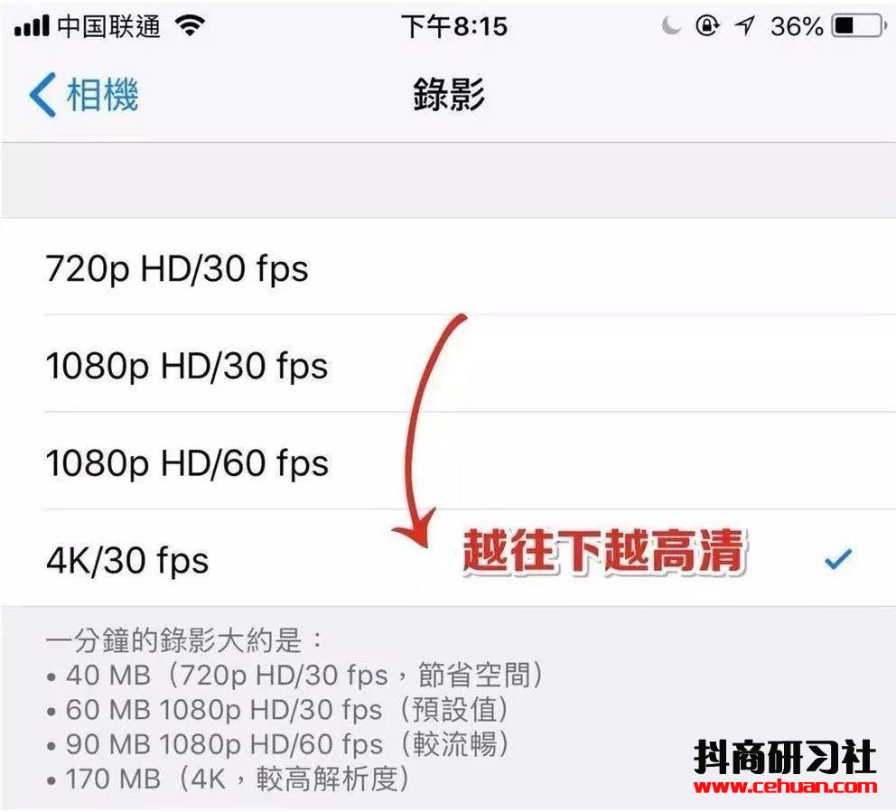 那么分辨率在哪里設(shè)置?以iphone7P舉例:點(diǎn)擊設(shè)置 > 相機(jī) > 錄影 > 4k/30fps 清晰度越往下就越高清,選擇你手機(jī)上最高清的分辨率。
