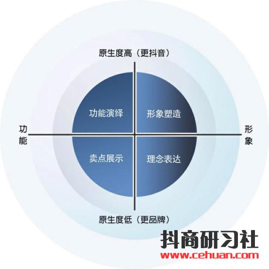 抖音企業(yè)號內(nèi)容“四象限”: 根據(jù)企業(yè)號生產(chǎn)的內(nèi)容的展現(xiàn)形式和展現(xiàn)目的,可以把企業(yè)號生產(chǎn)內(nèi)容分為四個象限。
