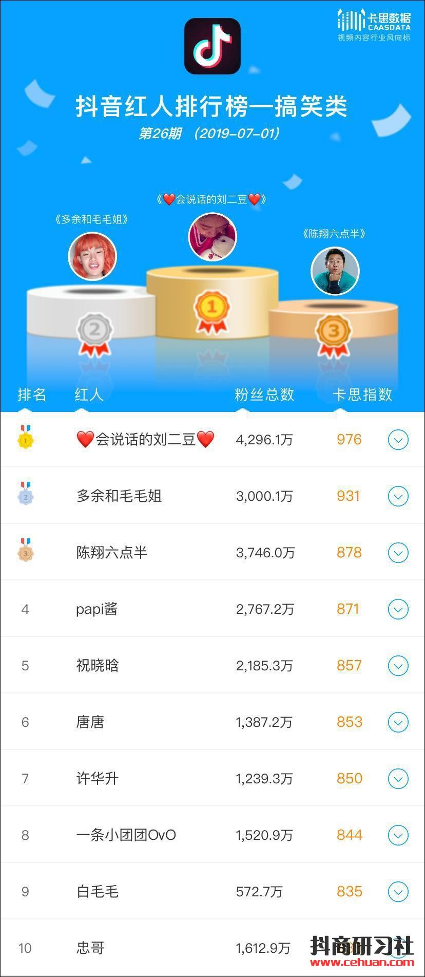 標(biāo)準(zhǔn)一定是建立在海量信息上的。所以第一步,我們需要打開所選平臺的分類榜單,如抖音-搞笑,至少將TOP200紅人的內(nèi)容及商業(yè)化數(shù)據(jù)拿來品一品,對比頭部及腰部賬號的情況后對整個品類的情況心里有數(shù)。
