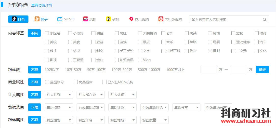 打開“智能篩選”功能,按照內(nèi)容標(biāo)簽、粉絲數(shù)、商業(yè)屬性、紅人屬性、數(shù)據(jù)范圍、粉絲屬性輸入自家紅人的數(shù)值,在結(jié)果中找到你的競爭對手。