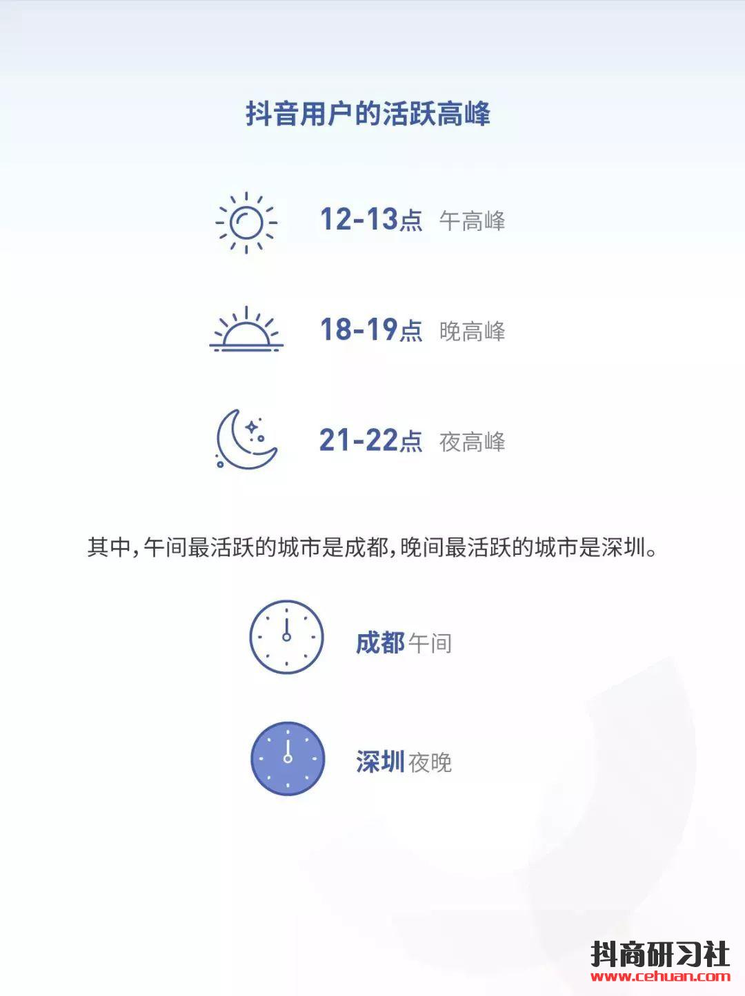 根據(jù)抖音發(fā)布的《2018年大數(shù)據(jù)報告》顯示,抖音用戶的活躍高峰期有如下三個: