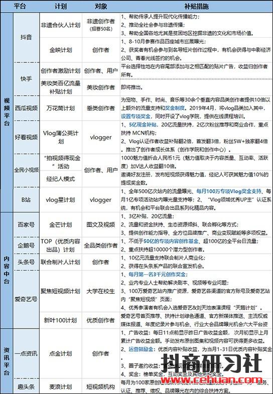 比如平臺(tái)普遍不再將現(xiàn)金作為作為優(yōu)質(zhì)內(nèi)容的主要鼓勵(lì)手段,正在進(jìn)行的也僅有西瓜視頻“萬(wàn)花筒計(jì)劃”、好看視頻“vlog蒲公英計(jì)劃”、企鵝號(hào)“TOP”計(jì)劃、愛奇藝號(hào)“聚焦短視頻計(jì)劃”、一點(diǎn)資訊“點(diǎn)金計(jì)劃”6項(xiàng)策略。