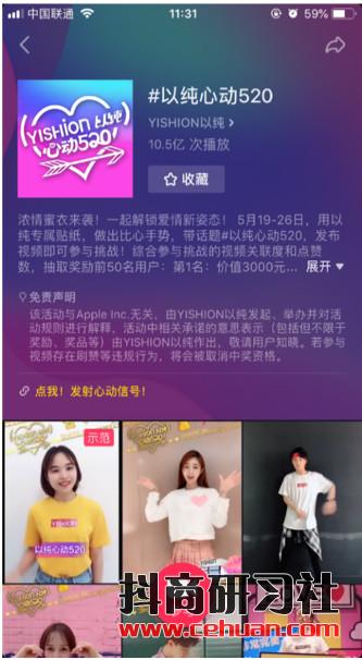 為了在年輕消費(fèi)群中實(shí)現(xiàn)最大程度的品牌曝光,以純于今年520表白節(jié)在抖音上打造了一場(chǎng)以“以純心動(dòng)520挑戰(zhàn)賽、夏季新品硬廣投放、達(dá)人到店換裝潮拍、重點(diǎn)門店打卡及線上反哺”四大維度開(kāi)展的整合玩法。