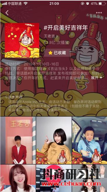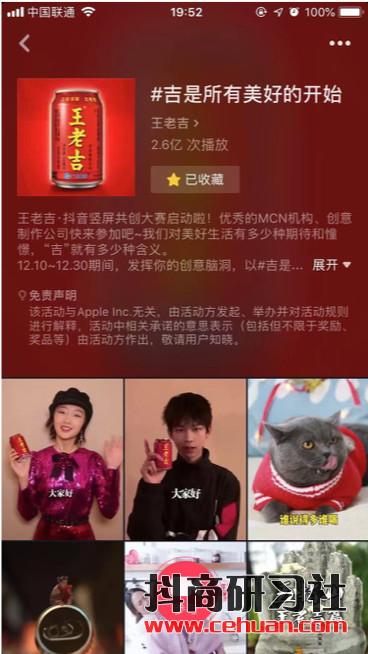 在新年之際,王老吉登陸抖音,由“豎屏共創(chuàng)大賽”聯(lián)合發(fā)起人周冬雨及斯外戈發(fā)布視頻,向大家征集“吉”的含義。緊隨其后,一場(chǎng)由PGC、UGC共同組成的豎屏創(chuàng)意大賽在平臺(tái)上掀起,其中#吉是所有美好的開(kāi)始 話題在短短20天內(nèi),共收獲2914件作品,收獲2.6億播放量。而#開(kāi)啟美好吉祥年 話題則吸引超過(guò)52萬(wàn)抖音用戶參與UGC創(chuàng)作,VV量突破60億。