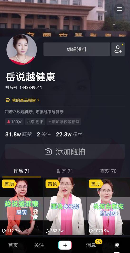 好了,我們再來看看下一個案例,岳說越健康 這個號,這個號我們用了不到兩個月做到了20萬粉絲 ,而且是垂直領(lǐng)域的精準粉絲,目前通過專家遠程問診及養(yǎng)生食品的銷售及中藥調(diào)理的收入已達67萬元 。