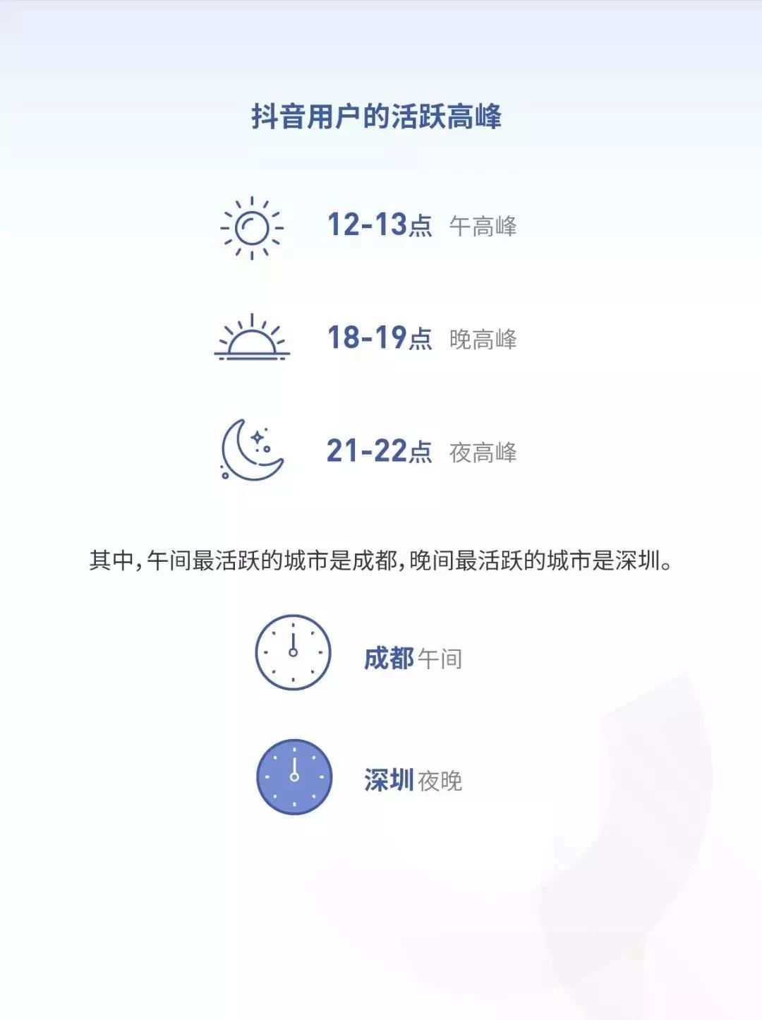 抖音作為新媒體平臺(tái)新秀,同自媒體圖文、微博、微信公眾號(hào)一樣,也有用戶活躍時(shí)間段。只有了解了用戶的活躍時(shí)間段,并選擇在用戶活躍時(shí)間段發(fā)布短視頻內(nèi)容,才能達(dá)到事半功倍的傳播效果。根據(jù)抖音發(fā)布的《2018年大數(shù)據(jù)報(bào)告》顯示,抖音用戶的活躍高峰期有如下: