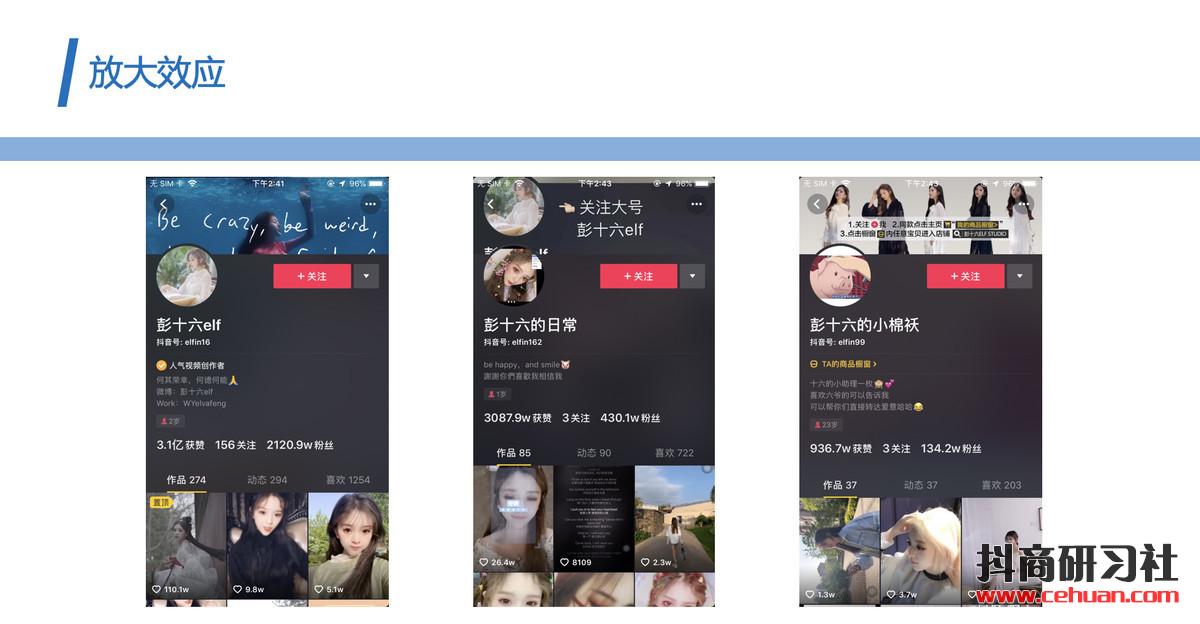 針對有漲粉瓶頸的大號,或者想利用大號品牌導(dǎo)流的小號,可以通過不同類型的內(nèi)容放大想傳遞給用戶的核心概念。例如抖音達人彭十六,除了母帳號”彭十六elf”以外,還有其他子帳號”彭十六的日常”、”彭十六的小棉襖”,通過助理視角日常生活視角,為彭十六增強品牌影響力。