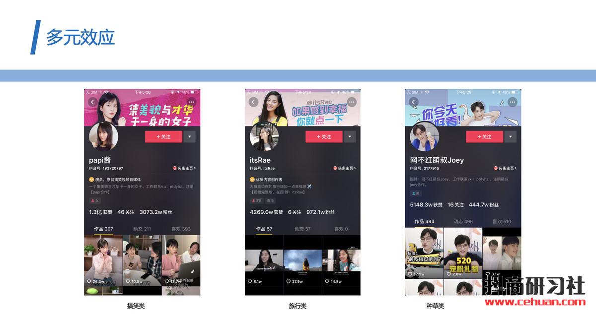 同一公司主體或者品牌,針對不同人群興趣圈層,有選擇性地拍攝垂類內(nèi)容進行吸粉。提高主體的內(nèi)容溢價能力,減少運營成本,形成內(nèi)容規(guī)模效應(yīng)。例如同一公司針對喜歡搞笑、旅行、種草的人群,分別設(shè)立不同的賬號,擴大不同維度的人群圈層。