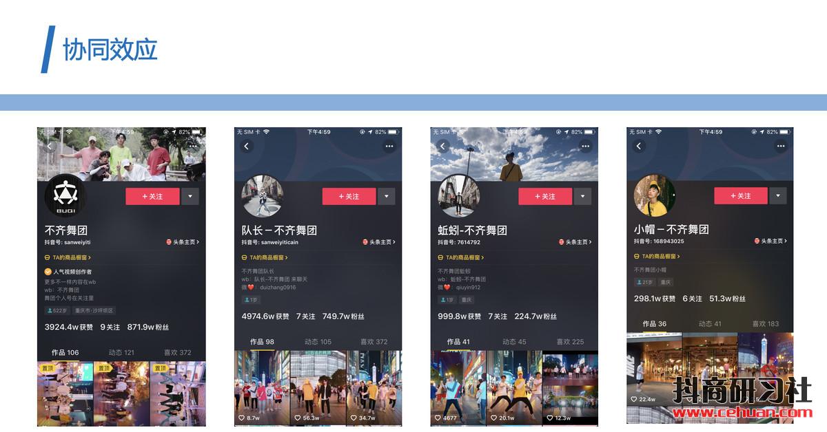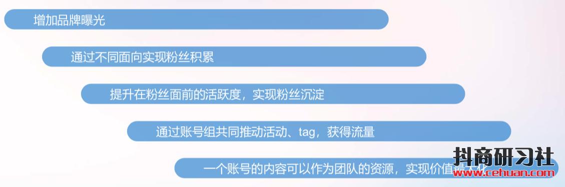 同一矩陣下賬號形成一個類團體組合,賬號內(nèi)容相互串聯(lián),并相互引導(dǎo)流量。不突強調(diào)個人或者賬號的影響力,目的都是為了讓品牌或者團體的價值最大化。