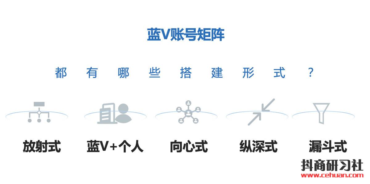 排兵布陣有講究 //最常見的帳號矩陣有五種形式,分別是:放射式、藍V+個人、向 心式、縱深式、漏斗式 ,不管你是做品牌求曝光還是想做銷售轉(zhuǎn)化,都有適合的矩陣類型。