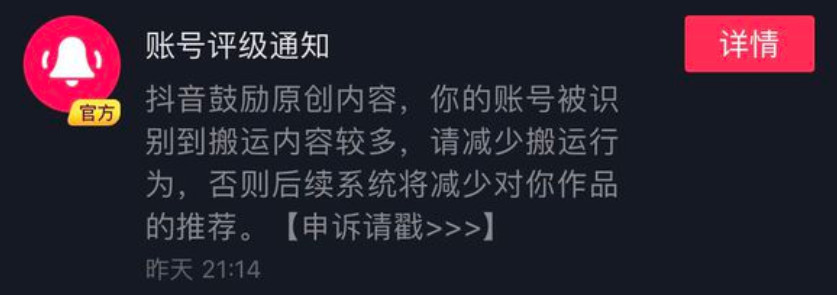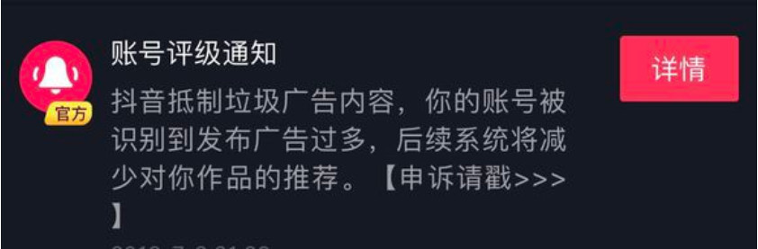 發(fā)布的廣告或者搬運(yùn)視頻過(guò)多,基本上都會(huì)碰到賬號(hào)被評(píng)級(jí)的情況。收到“賬號(hào)評(píng)級(jí)通知”,對(duì)你的處罰基本上就是:后續(xù)將減少對(duì)你作品的推薦。