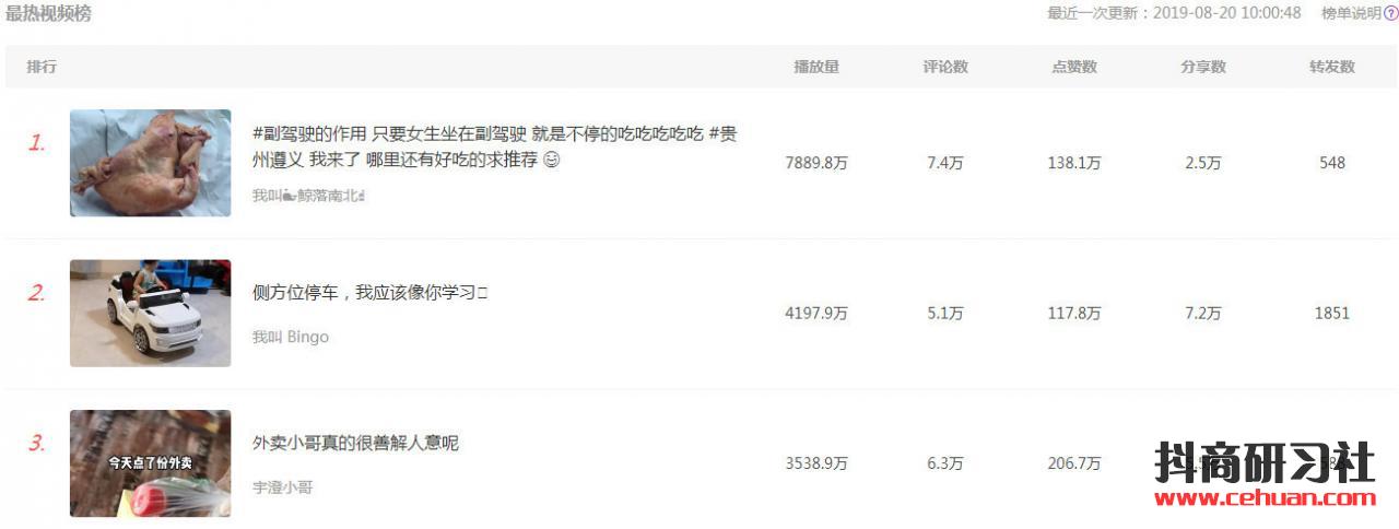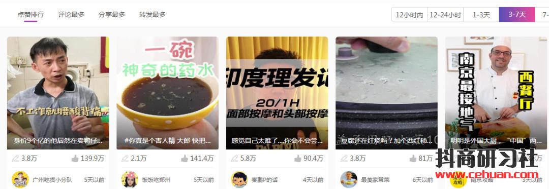 通過對(duì)熱門視頻的點(diǎn)贊、評(píng)論、分享、轉(zhuǎn)發(fā)等排名來了解同領(lǐng)域不同類型的熱門視頻在這幾個(gè)分類中排名,了解目標(biāo)群體的具體喜好,有利于新賬號(hào)的內(nèi)容定位。