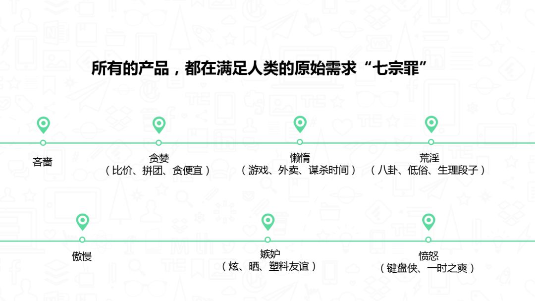 所有的產(chǎn)品其實都是在滿足人類原始需求當中的七宗罪,所有的產(chǎn)品歸結(jié)起來,就是利用人性的弱點,我們的先哲先知把它歸結(jié)為七宗罪。