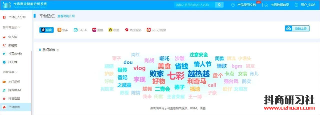 比如卡思數(shù)據(jù)商業(yè)版“平臺(tái)熱點(diǎn)”功能。提供了七大短視頻平臺(tái)近七天內(nèi)的的熱點(diǎn)詞云數(shù)據(jù),該熱點(diǎn)詞云基于七天內(nèi)的視頻標(biāo)題以及視頻評(píng)論熱詞。