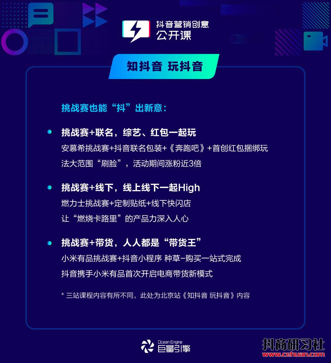 抖音營(yíng)銷創(chuàng)意公開(kāi)課是由巨量引擎開(kāi)啟的系列課程計(jì)劃,與一線運(yùn)營(yíng)者面對(duì)面,分享抖音營(yíng)銷創(chuàng)意秘訣。其全年規(guī)劃多季課程,課程內(nèi)容涉及視頻創(chuàng)意構(gòu)想、運(yùn)營(yíng)優(yōu)質(zhì)賬號(hào)等一線運(yùn)營(yíng)者關(guān)心的重點(diǎn)話題,每季選取一個(gè)焦點(diǎn)話題,在上海、北京、廣州三地,分別進(jìn)行課程分享。