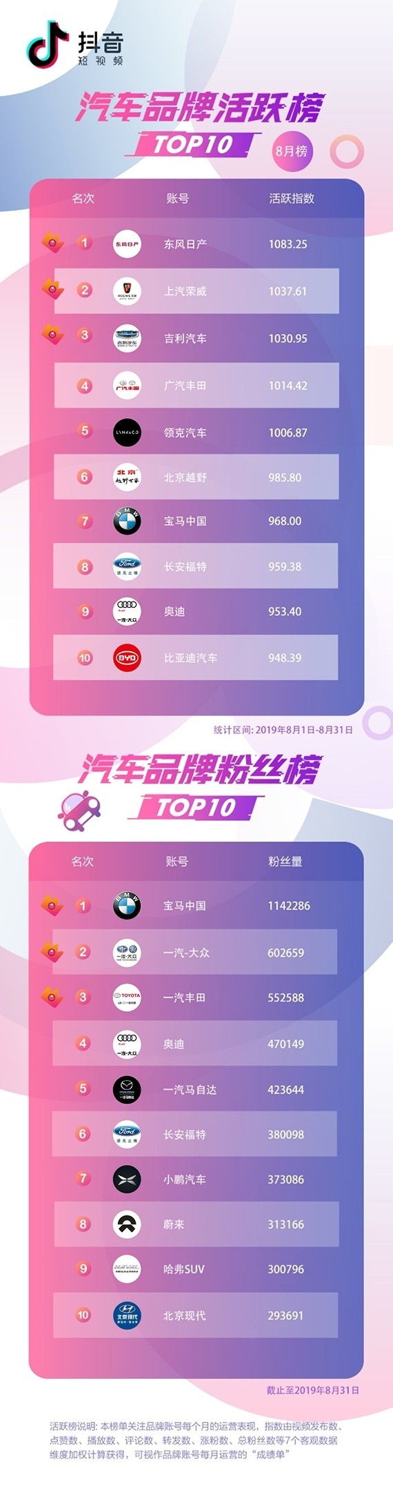 抖音官方發(fā)布企業(yè)藍V 8月榜單:「抖音行業(yè)藍V活躍榜」「抖音行業(yè)藍V粉絲榜」?!?月藍V榜單中,各行業(yè)企業(yè)藍V中,既有穩(wěn)定領(lǐng)跑的優(yōu)質(zhì)頭部賬號,也有緊追直上的后起之秀賬號,行業(yè)結(jié)構(gòu)不斷豐富并趨于平衡,大企業(yè)與中小企業(yè)運營各有特色,勢均力敵。抖音藍V營銷賽道正在一步步走向多元化。