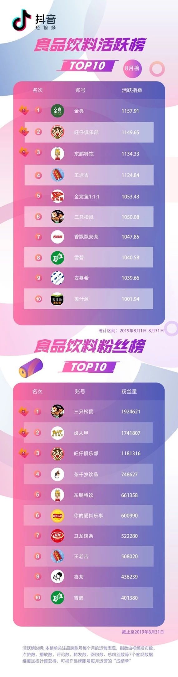 8月,食品飲料品牌活躍榜新增眾多知名品牌,「金龍魚1:1:1」、「香飄飄奶茶」、「美汁源」均表現(xiàn)活躍。其中「金龍魚1:1:1」賬號運營相較以往獲得較大突破,憑借8月挑戰(zhàn)賽 #2019舞出好比例,獲得了7009萬次播放和9.3萬新增粉絲。此外,「金典」、「旺仔俱樂部」、「東鵬特飲」、「王老吉」則持續(xù)保持著穩(wěn)定靠前的賬號運營表現(xiàn)。