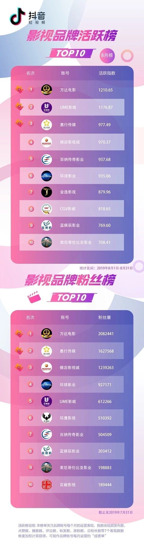 8月,「萬達電影」憑借遙遙領(lǐng)先的運營表現(xiàn)重回影視品牌活躍榜榜首,「UME影城」、「嘉行傳媒」與其一同占據(jù)活躍榜top3?!腑h(huán)球影業(yè)」、「索尼哥倫比亞影業(yè)」等國際知名影視品牌也均有穩(wěn)定優(yōu)質(zhì)的表現(xiàn)?!窩GV影城」則憑借極其活躍的投稿表現(xiàn),成為本月活躍榜的新面孔。