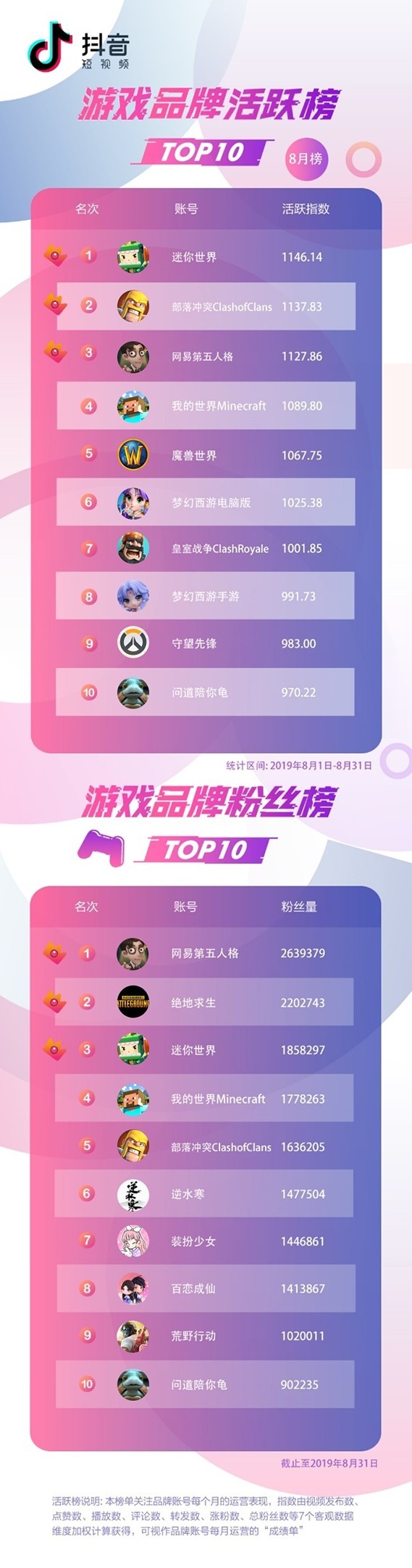 部落沖突增長強勁 //8月,「迷你世界」憑借更積極的投稿一舉登頂游戲品牌活躍榜榜首,本月投稿多達131條,獲得5164萬次播放和18.8萬新增粉絲?!覆柯錄_突ClashofClans」、「網(wǎng)易第五人格」則分別位居第二、三位。本月夢幻西游游戲品牌賬號強勢發(fā)力,「夢幻西游電腦版」、「夢幻西游手游」均有較活躍的運營表現(xiàn),雙雙進入游戲活躍榜。此外,「皇室戰(zhàn)爭ClashRoyale」本月亦重回活躍榜。