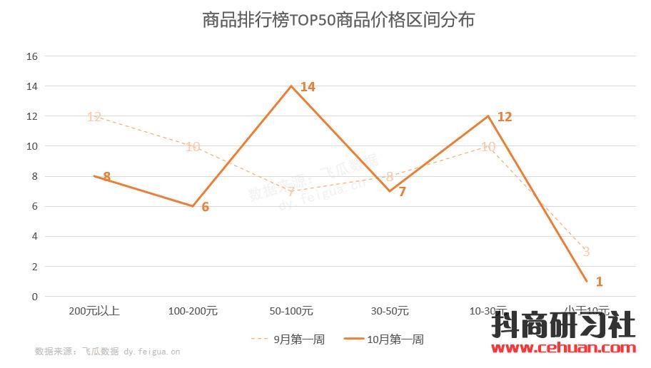 而從商品排行榜TOP50的價格區(qū)間分布中,可以看到同比9月正常工作日來看,價格多數(shù)集中在50-100元區(qū)間 ,比之前多數(shù)集中在50元以下,平均價格有所提高,可見假期會適當提高用戶的購買欲望。