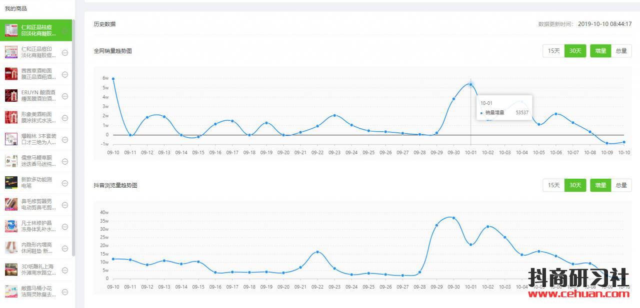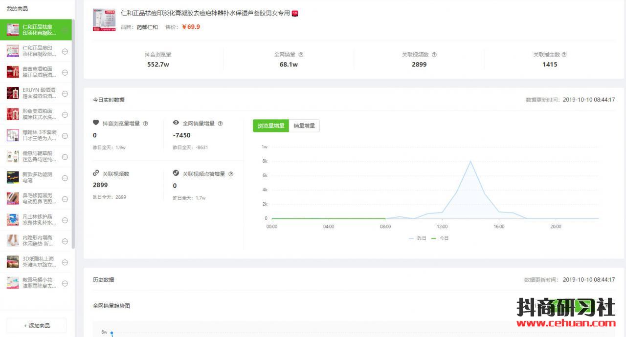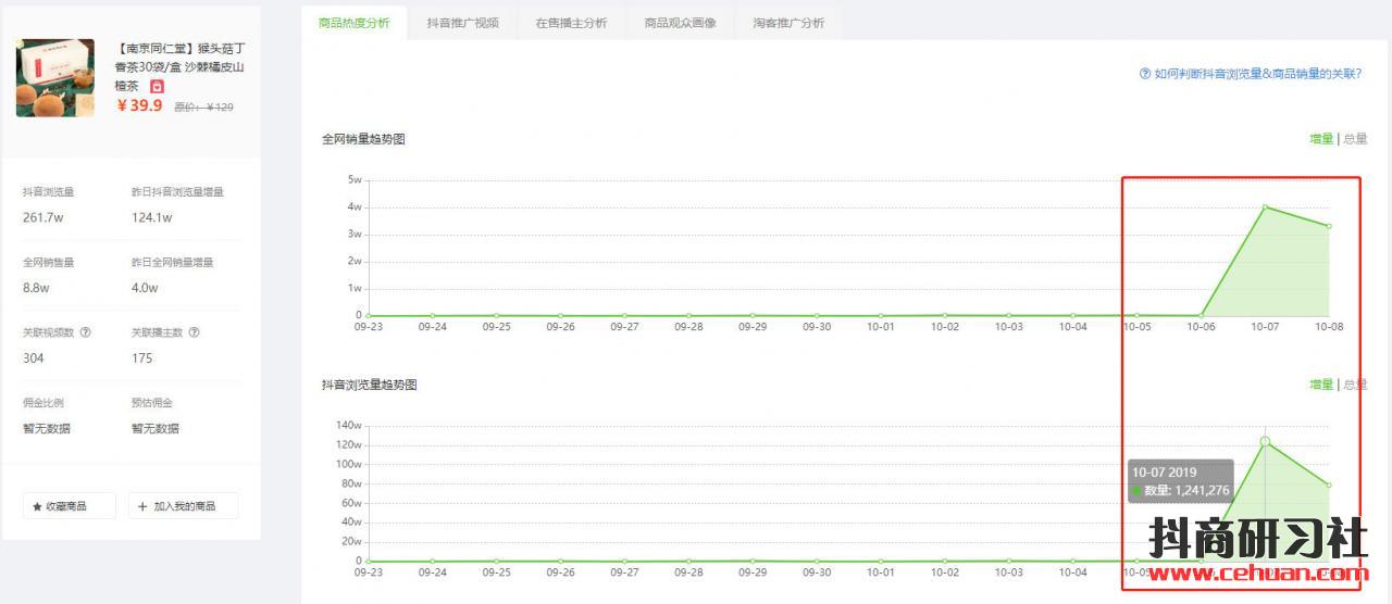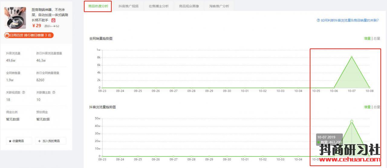 通過飛瓜數(shù)據(jù)的【商品熱度分析】,我們發(fā)現(xiàn)該商品在7號當天,抖音瀏覽量增量超過了46.3萬,銷售增量8200+ ,很明顯看到抖音瀏覽量和全網(wǎng)銷量的增長曲線基本一致,可以判斷出該商品的抖音推廣對全網(wǎng)銷量起到很大的促進作用。