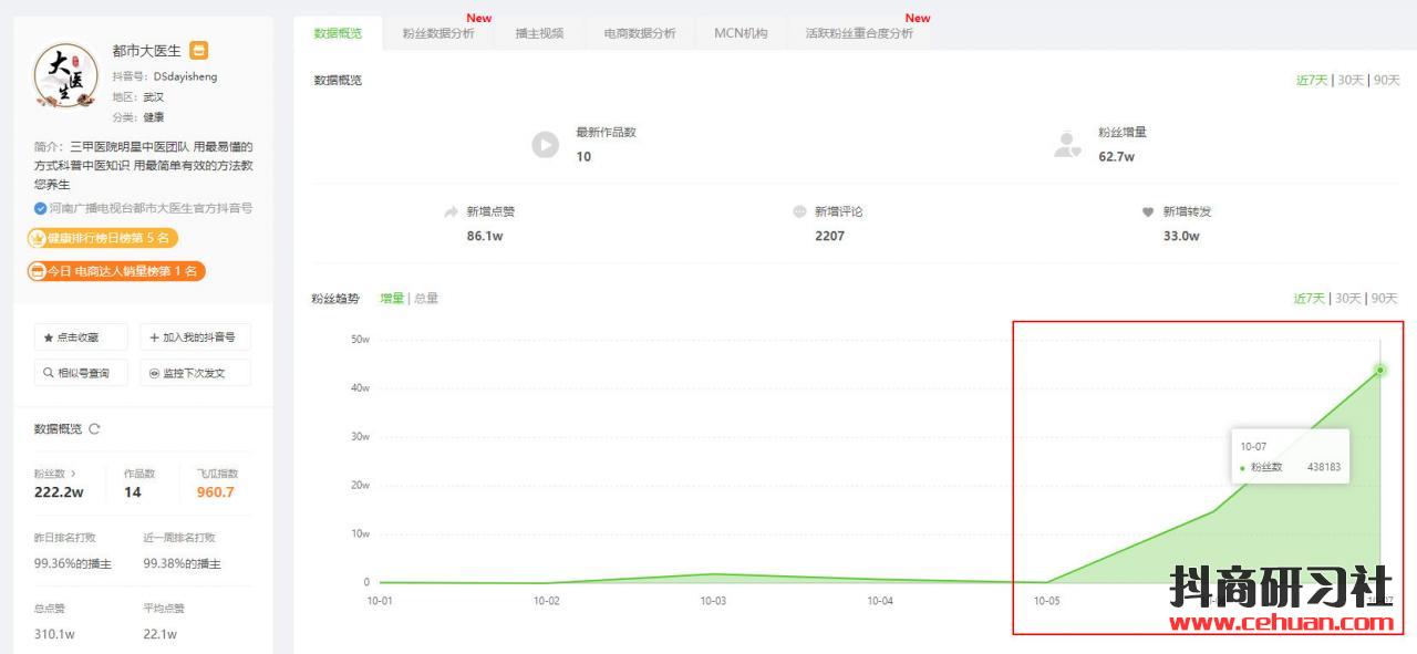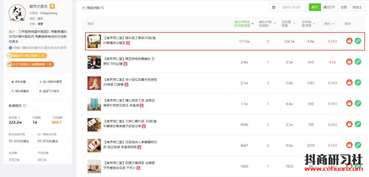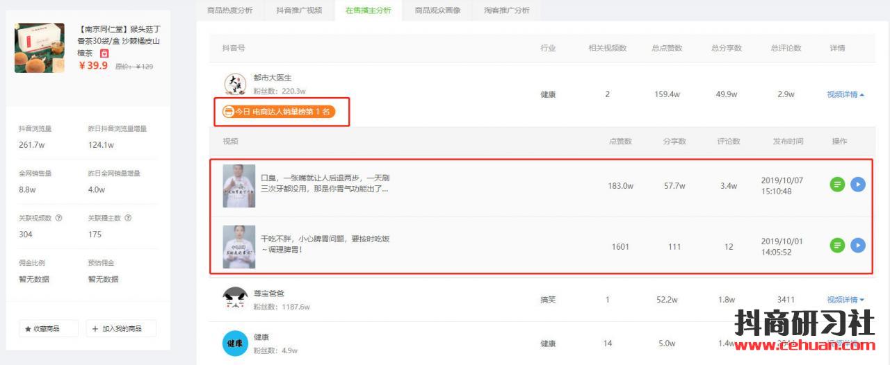 在查看【在售播主分析】的時候我們發(fā)現(xiàn),「都市大醫(yī)生」正好在當日(10.8)的電商達人銷售榜的第1名!