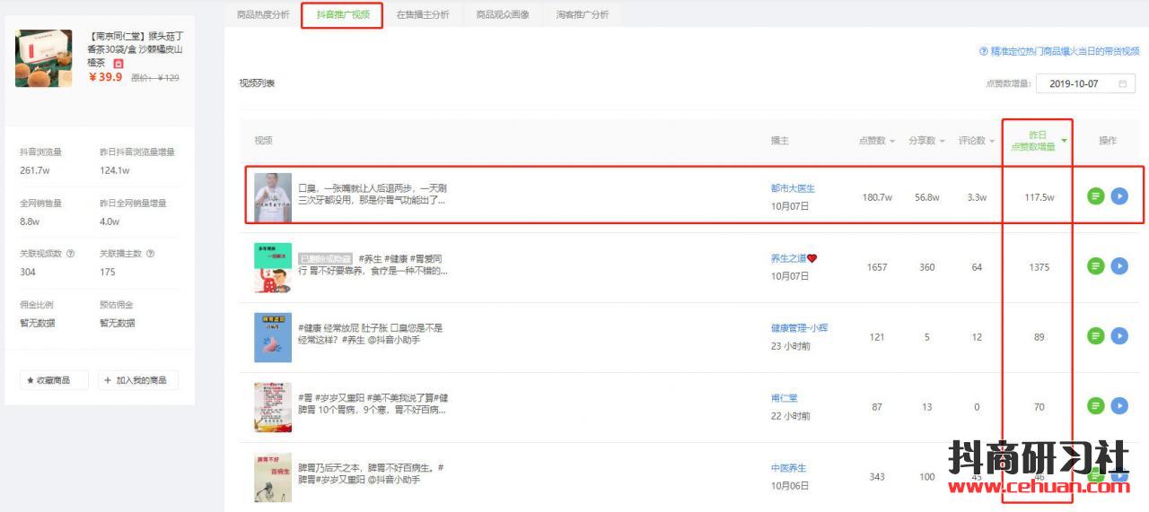 我們看到了“猴頭菇丁香茶”關(guān)聯(lián)商品的視頻中「都市大醫(yī)生」的視頻“口臭,一張嘴就讓人后退兩步”的昨日點贊量最高,達到了117.5萬 ,而其他的推廣該商品的視頻并沒有太大的浮動,可推斷昨日瀏覽量的增量主要來自該視頻帶量。
