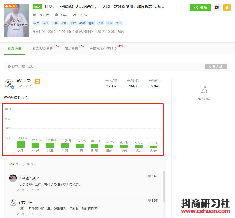 查看爆款推廣視頻的數(shù)據(jù),我們發(fā)現(xiàn)用戶評論的關(guān)鍵詞多以“謝謝”、“請問”、“試試” 為主,可見視頻話題獲得了抖音用戶的認同,引發(fā)了用戶的評論,3.4W評論助力視頻的熱度,正向的評論更是能促進成交。
