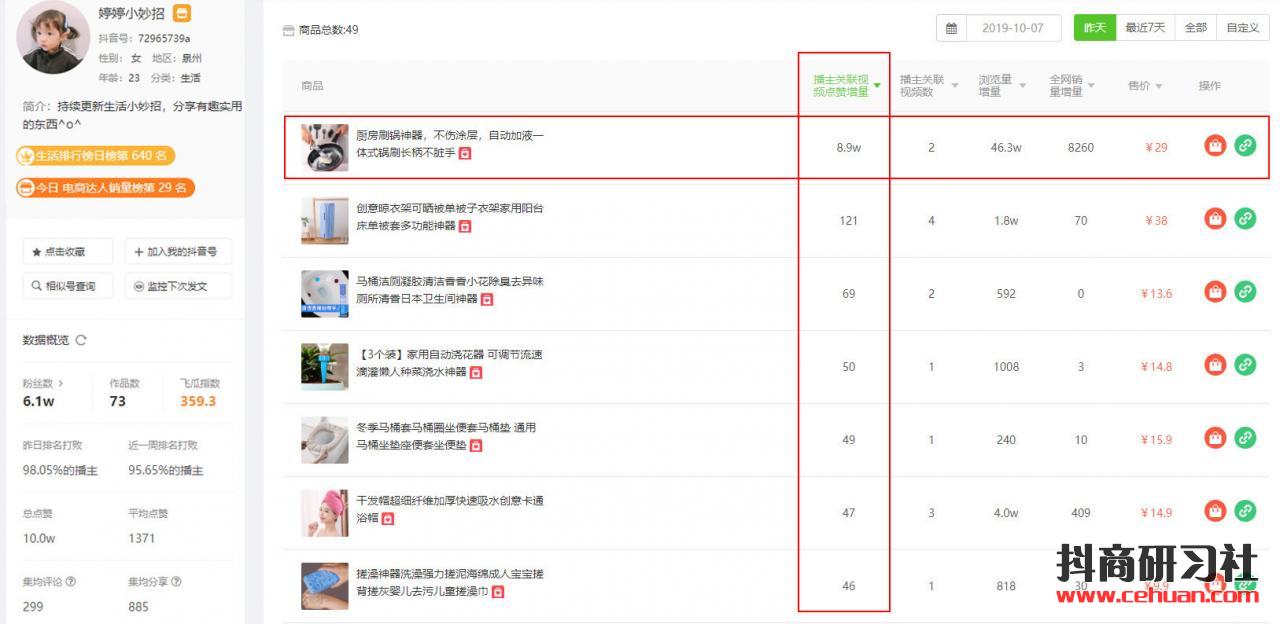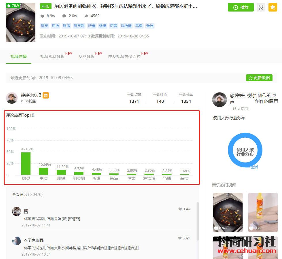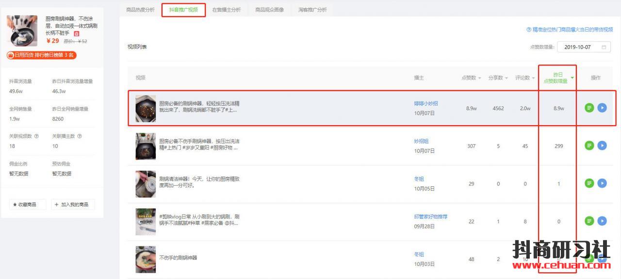 通過【關(guān)聯(lián)視頻分析】 我們可以看到,在這段時間內(nèi),「婷婷小妙招」推送的“廚房必備的刷鍋神器,輕輕按壓洗潔精就出來了”的視頻昨日點贊增量最高。