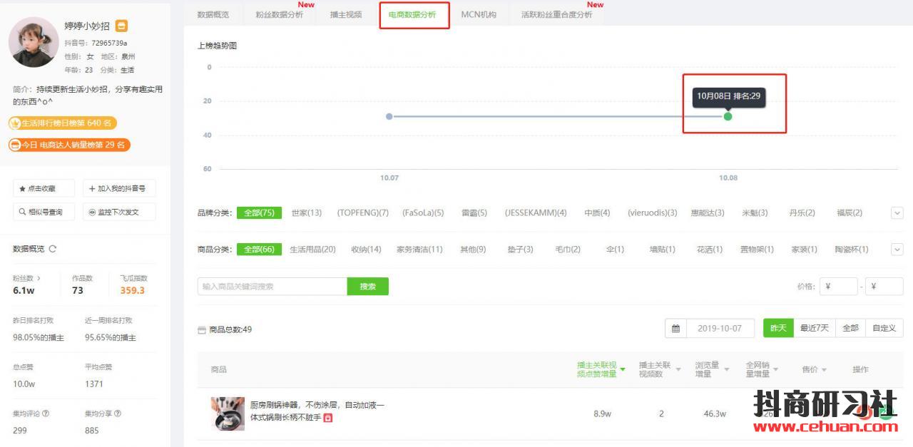 在查看該博主的時候我們發(fā)現(xiàn),僅有6.1萬粉絲的「婷婷小妙招」,在當日電商達人銷售榜的第29名。