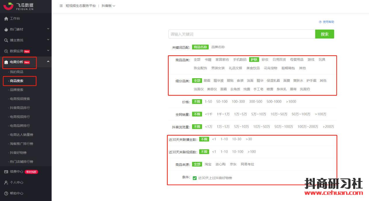 如果想要找到更多優(yōu)質(zhì)的商品,可以使用飛瓜數(shù)據(jù)的【商品搜索】 ,可以根據(jù)商品細分品類,以及商品近期在抖音推廣數(shù)據(jù) ,快速找到正在抖音上爆火的熱門商品。