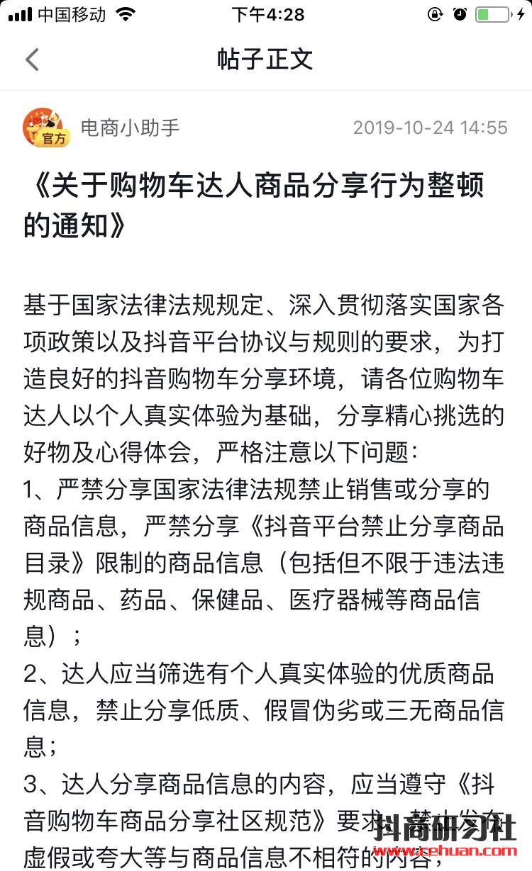 昨天(10月24日),抖音發(fā)布了《關(guān)于購物車達(dá)人商品分享行為整頓的通知》 ;并公布了部分商品分享功能關(guān)閉處罰賬號;