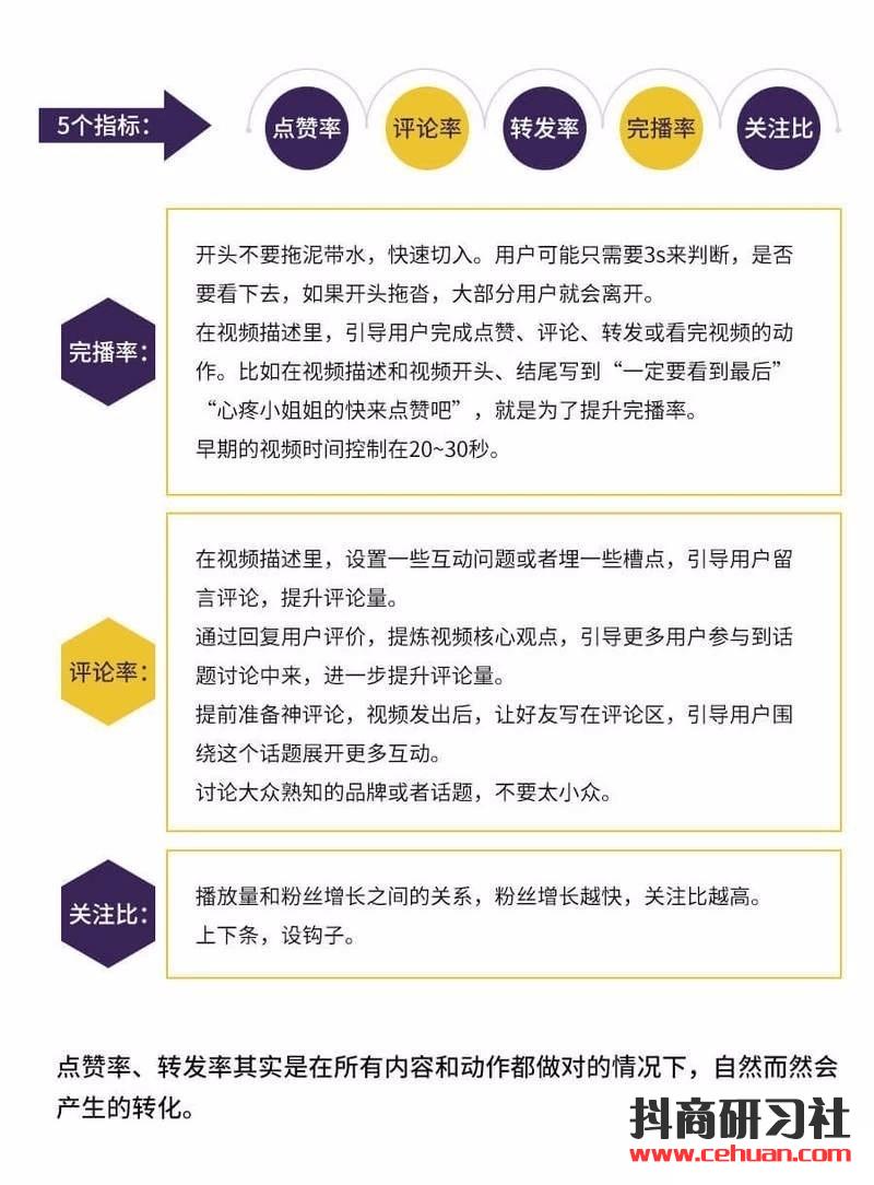 而系統(tǒng)如何判斷一個(gè)好視頻呢,就看這5個(gè)數(shù)據(jù)——完播率,點(diǎn)贊率,評(píng)論,轉(zhuǎn)發(fā),關(guān)注。所以建議前期不要做太長的視頻。此處透露一個(gè)99%的運(yùn)營都沒搞懂的干貨,抖音的完播率并不是指播完整個(gè)視頻,而是看完視頻總長度的一半就算完播了!