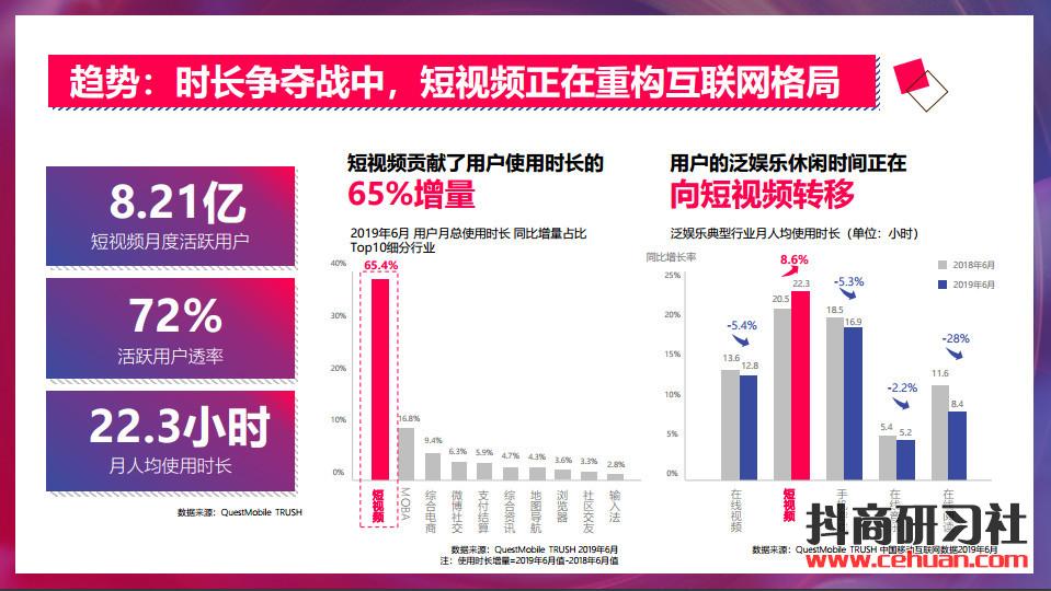 最新數(shù)據(jù)顯示,短視頻月活躍用戶8.21億,月人均使用時長22.3 小時。用戶的泛娛樂休閑時間正在向短視頻轉(zhuǎn)移,短視頻正在重構(gòu)互聯(lián)網(wǎng)格局。