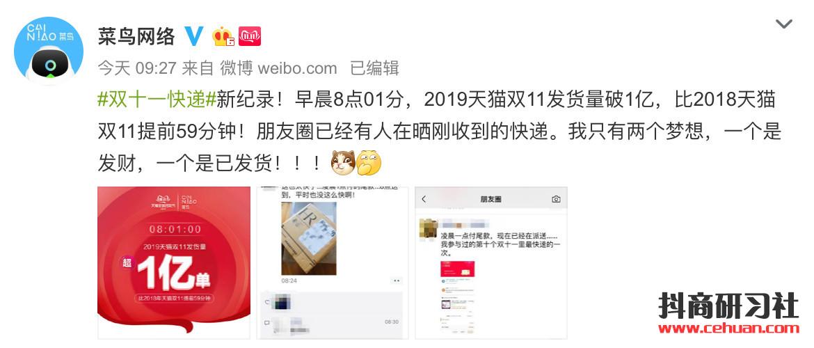 菜鳥網(wǎng)絡(luò)在官方微博宣布,11日早晨8點(diǎn)01分,2019天貓“雙11”發(fā)貨量破1億, 比2018天貓“雙11”提前59分鐘。
