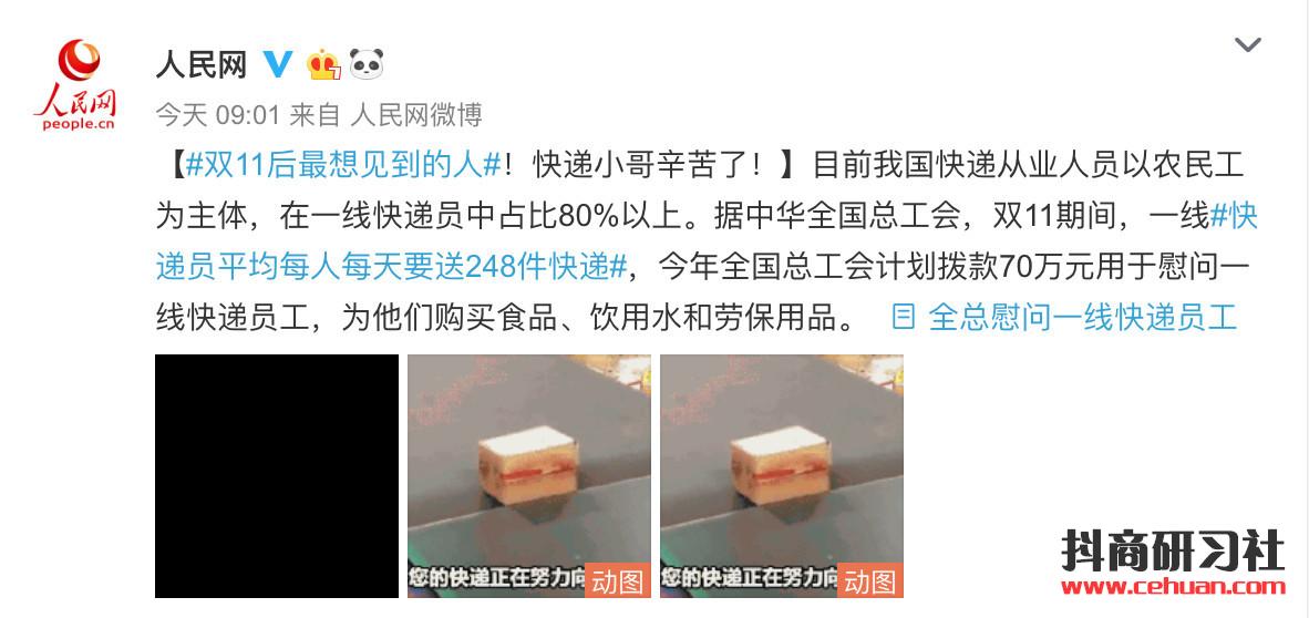 “雙11”最想見的人是誰?自然是快遞小哥! 人民網(wǎng)早間發(fā)布微博稱,目前我國(guó)快遞從業(yè)人員以農(nóng)民工為主體,在一線快遞員中占比80%以上。據(jù)中華全國(guó)總工會(huì),“雙11”期間,一線快遞員平均每人每天要送248件快遞。
