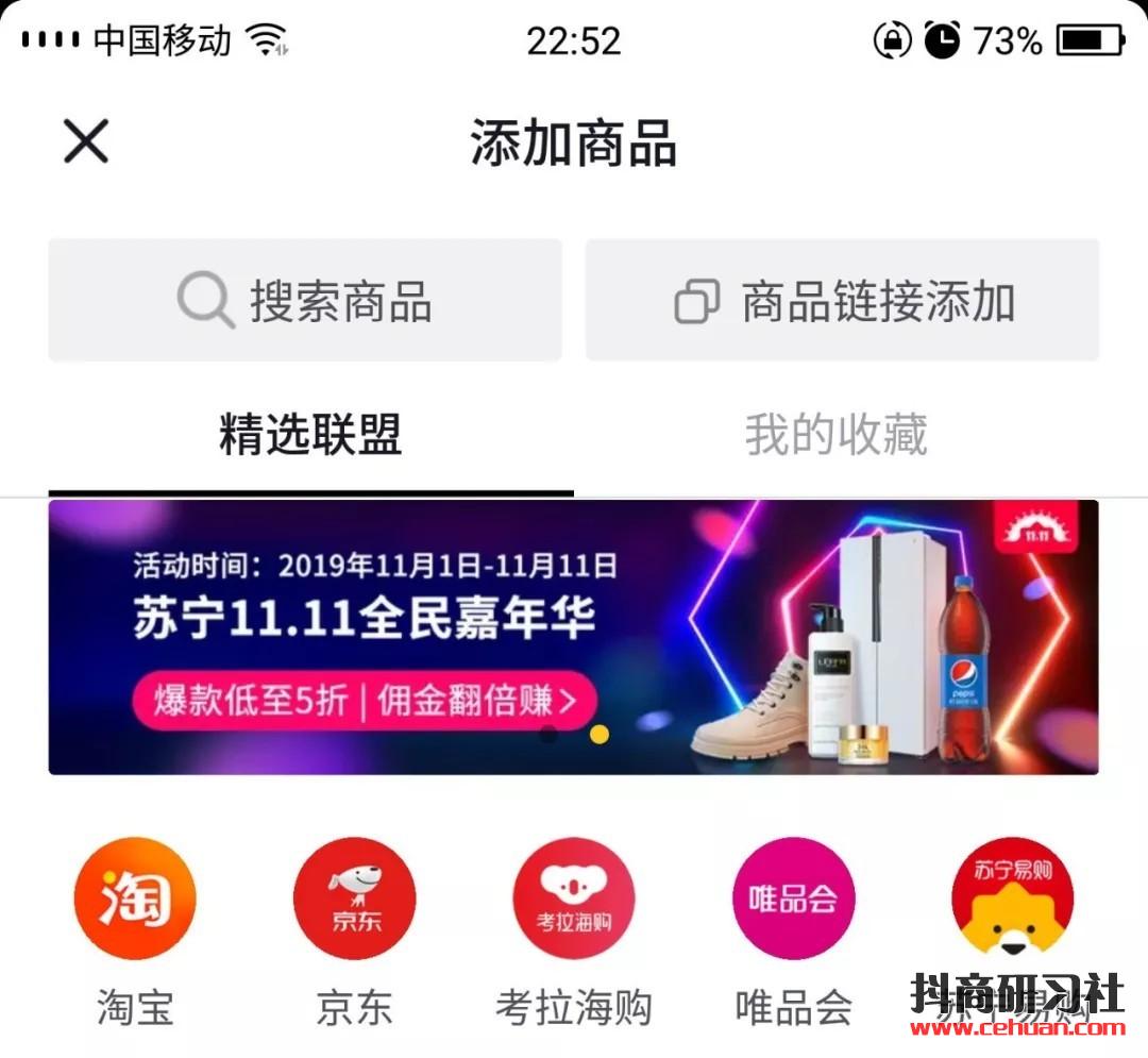 開(kāi)通之后,通過(guò)抖音的精選聯(lián)盟去添加商品,精選聯(lián)盟主要和淘寶、京東、考拉海購(gòu)、唯品會(huì)、蘇寧易購(gòu)這5個(gè)電商網(wǎng)站相關(guān)聯(lián)。