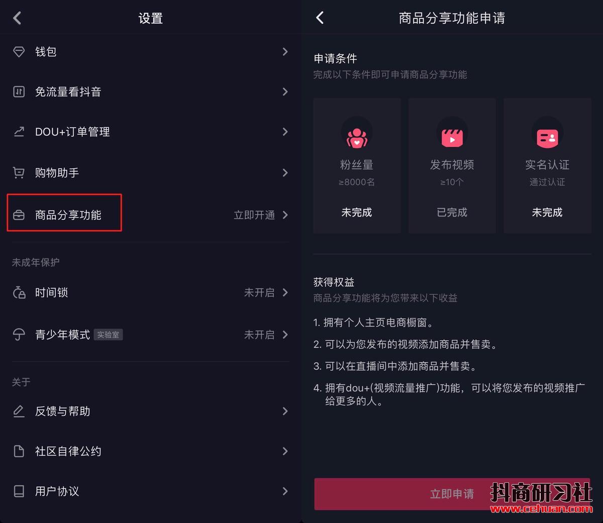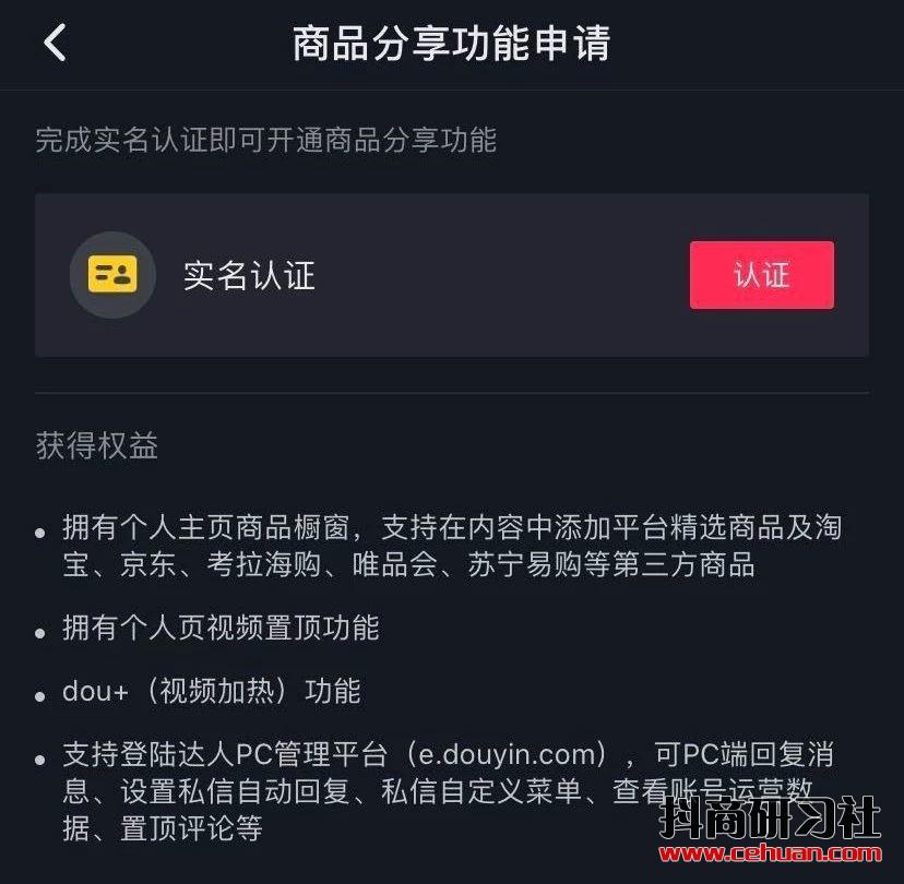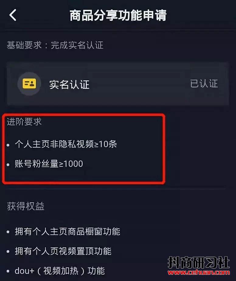 第二階段:實(shí)名認(rèn)證之后,發(fā)布視頻大于10個,粉絲數(shù)達(dá)到8000;符合標(biāo)準(zhǔn)的賬戶通過抖音應(yīng)用-我的-右上-商品分享功能自助申請開通,通過審核的視頻即可使用。