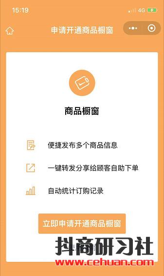 收到“點(diǎn)擊立即申請(qǐng)自助下單神器——”小程序的回復(fù)后點(diǎn)進(jìn)去,會(huì)進(jìn)入到“申請(qǐng)開通商品櫥窗”的頁(yè)面。