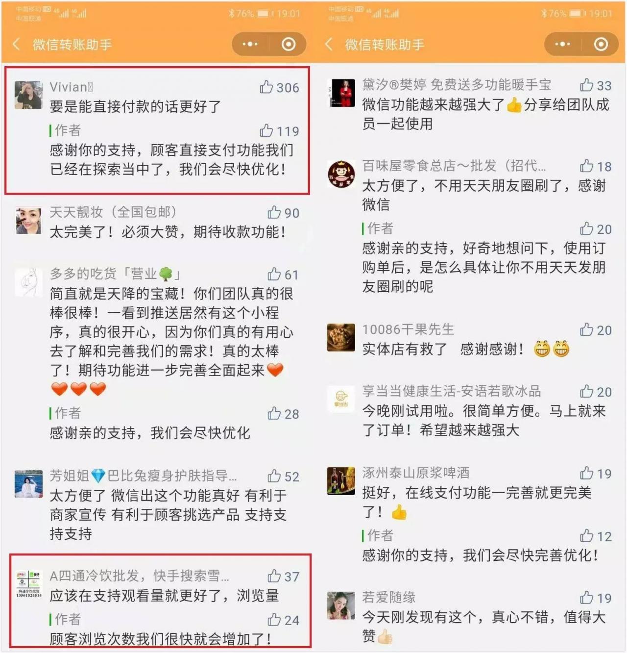 在“微信轉(zhuǎn)賬助手”發(fā)布的《使用指南》中,有用戶在留言中表示“要是能直接付款的話更好了”,“微信轉(zhuǎn)賬助手”回應(yīng)稱“顧客直接支付功能已經(jīng)在探索中,會(huì)盡快優(yōu)化”。